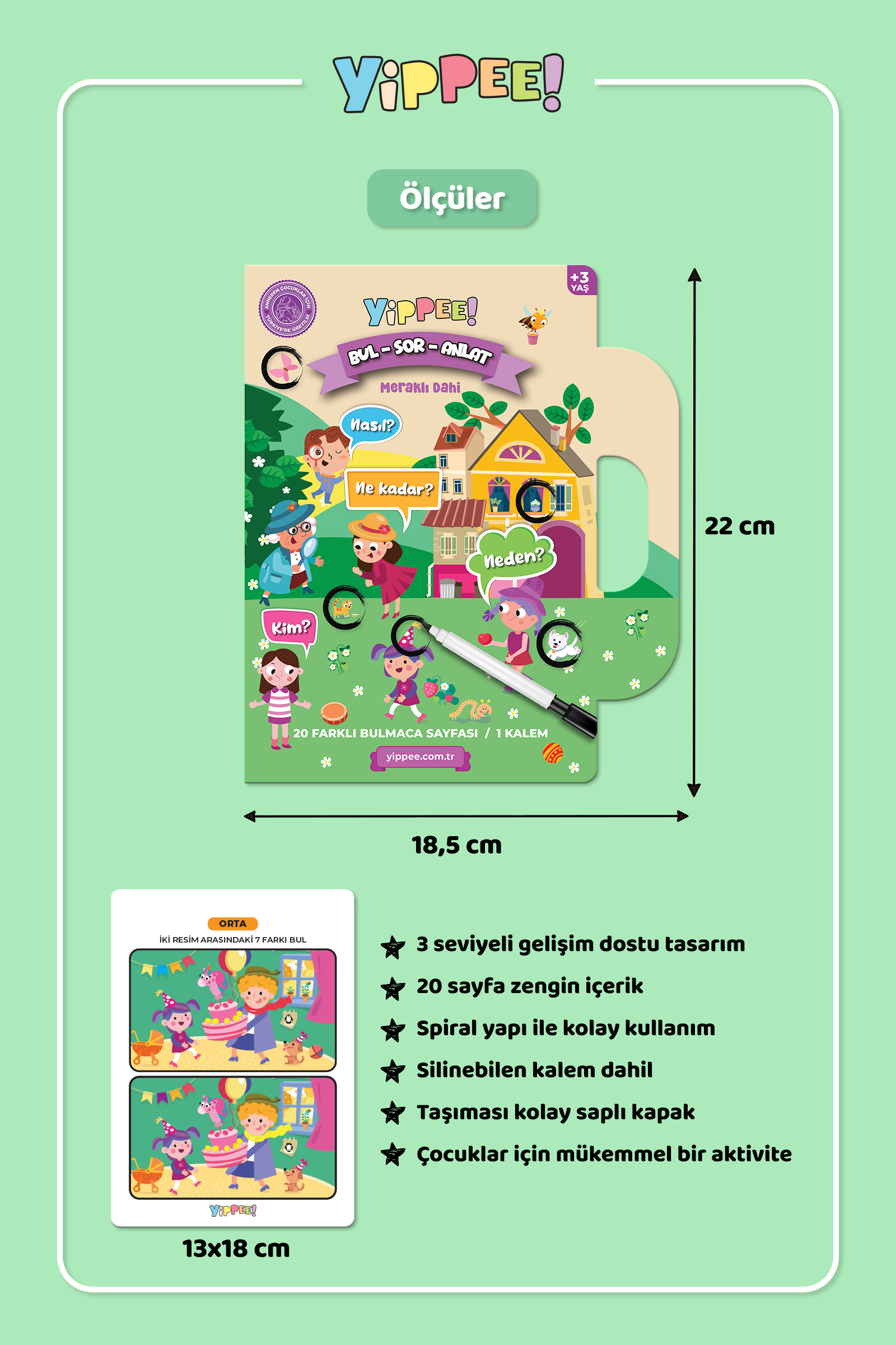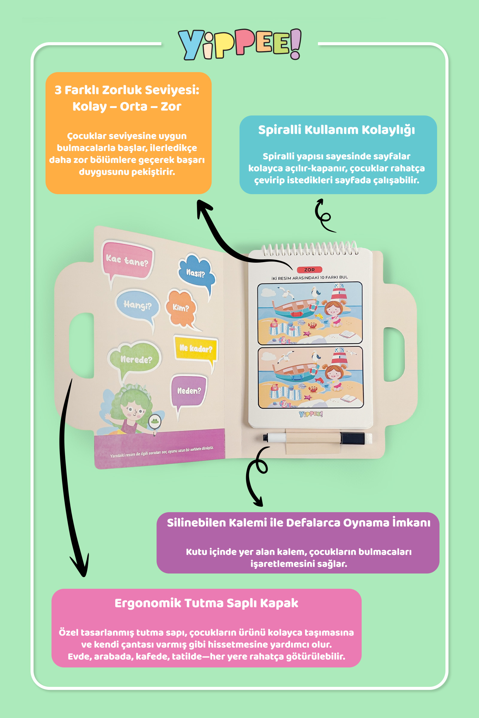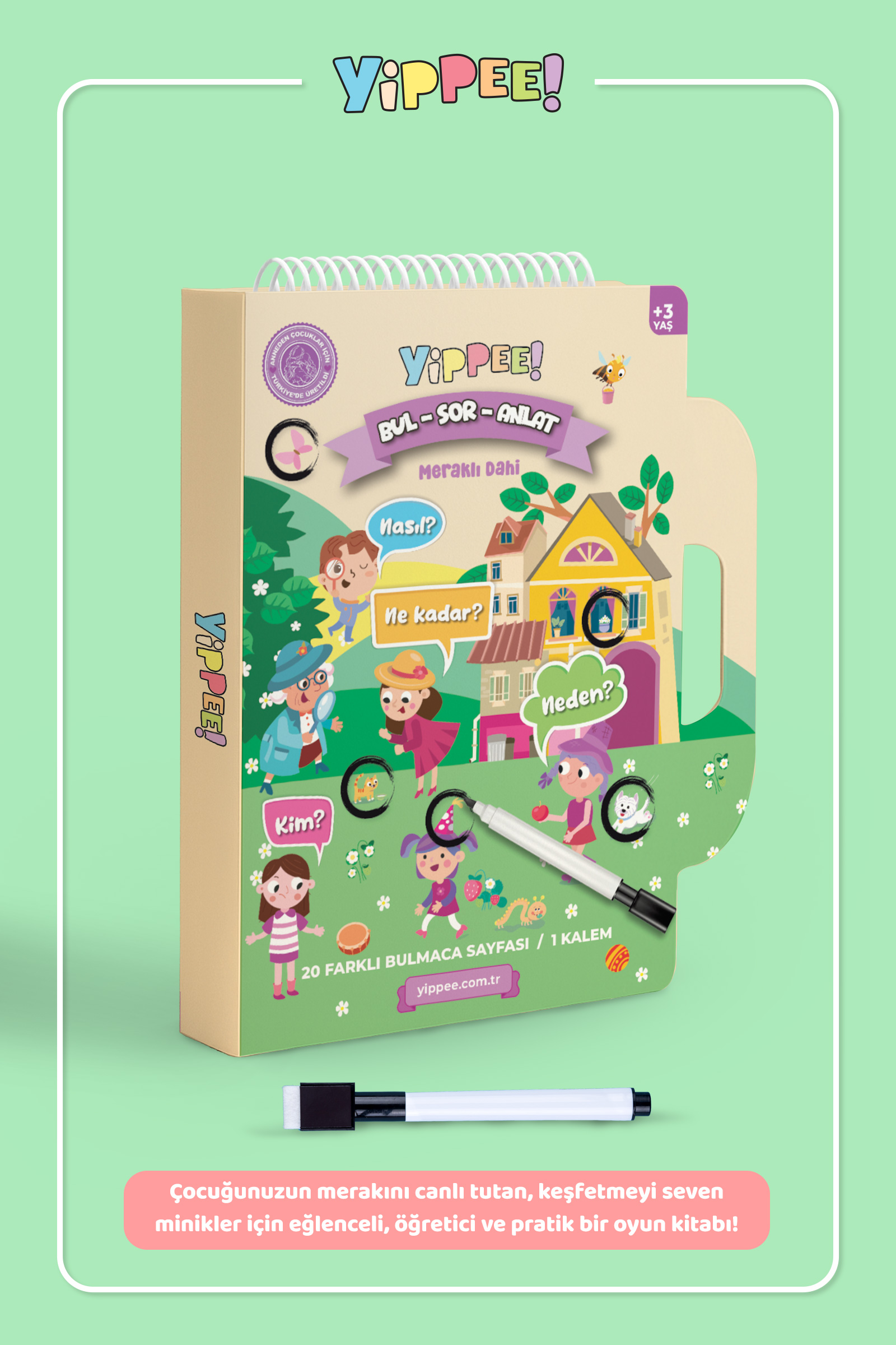 - 1 adet spiral yapıda Yippee Bul-Sor-Anlat Meraklı Dahi eğitici aktivite oyunu