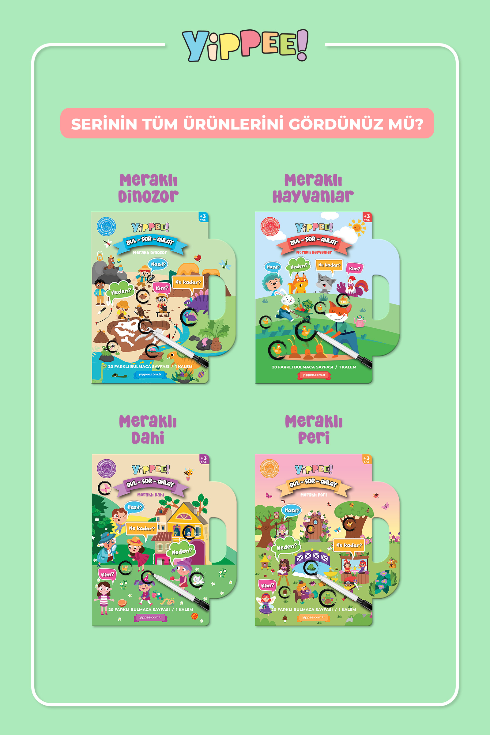 Yippee Bul-Sor-Anlat Meraklı Dahi, okul öncesi döneme uygun olarak tasarlanmış