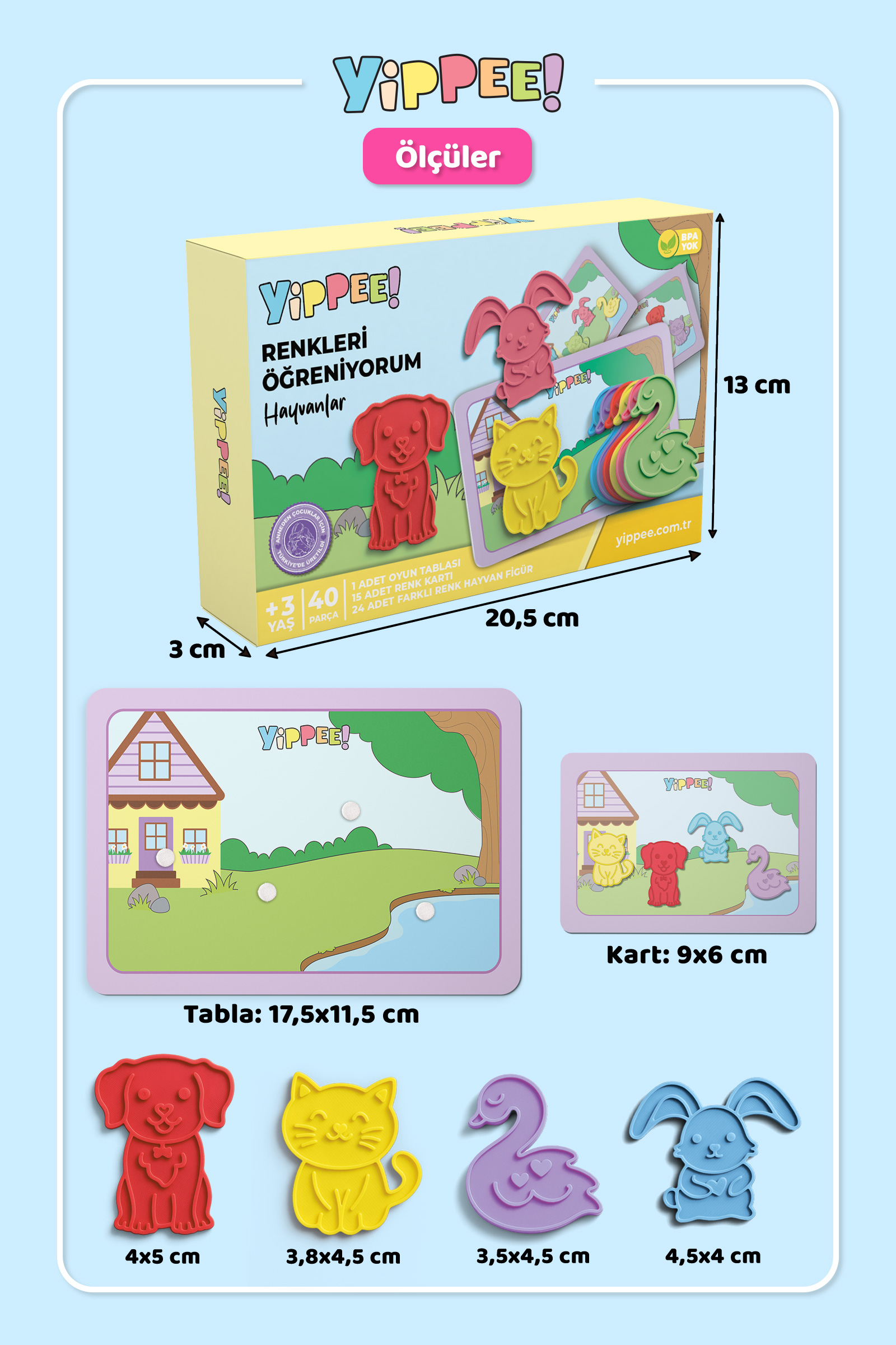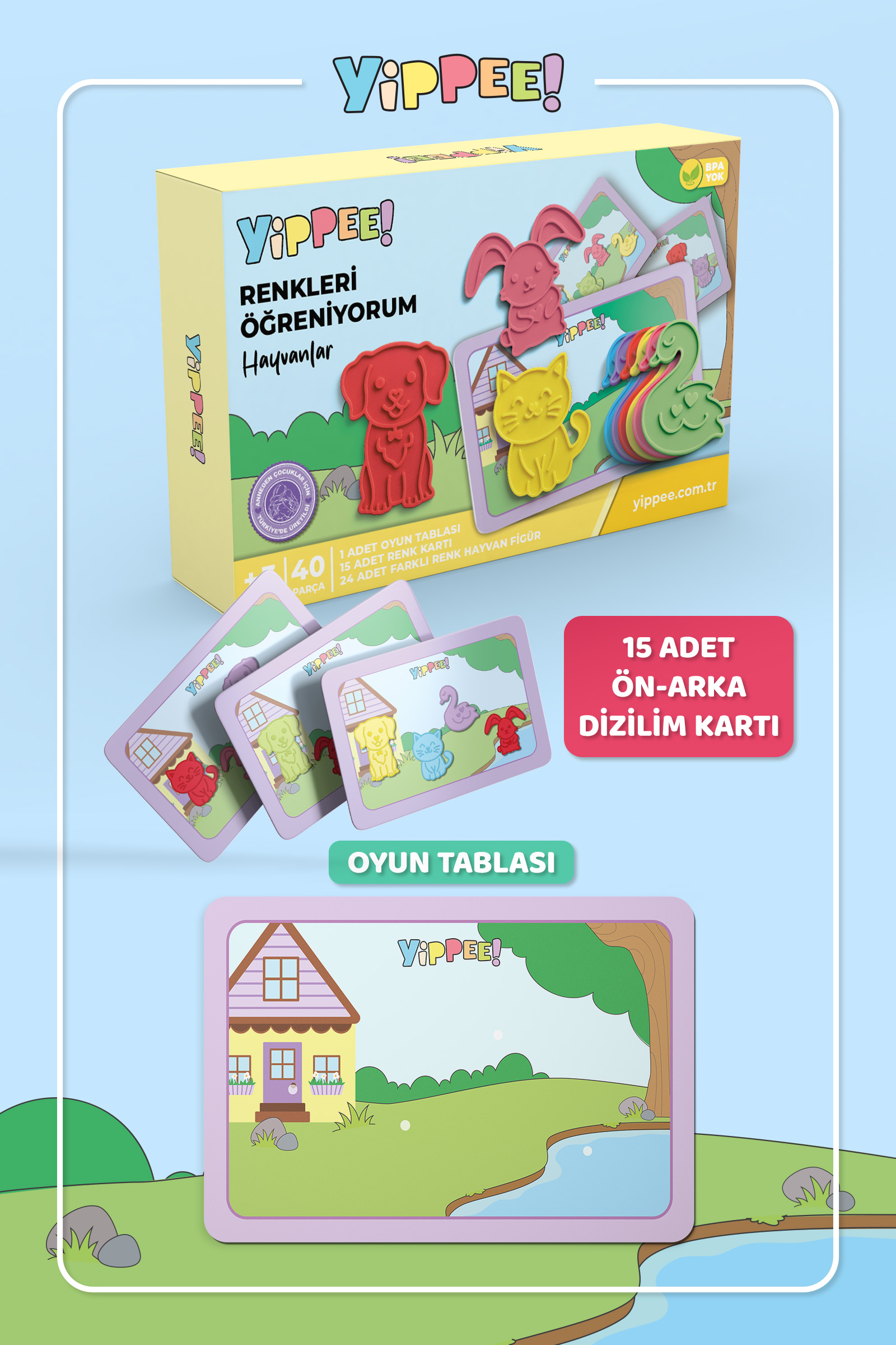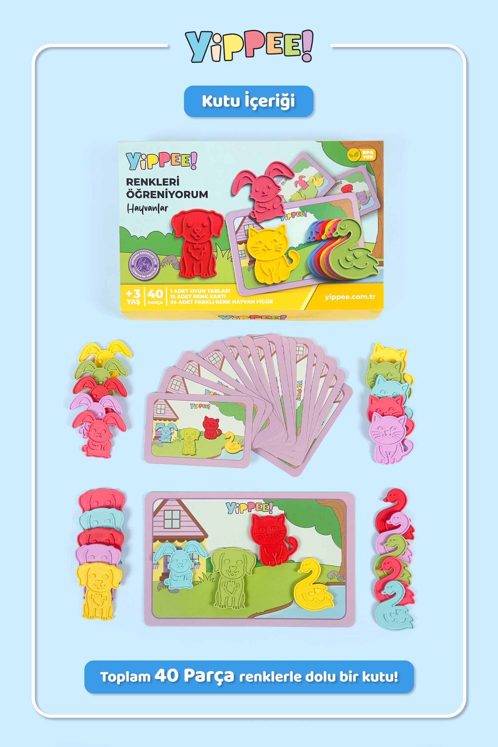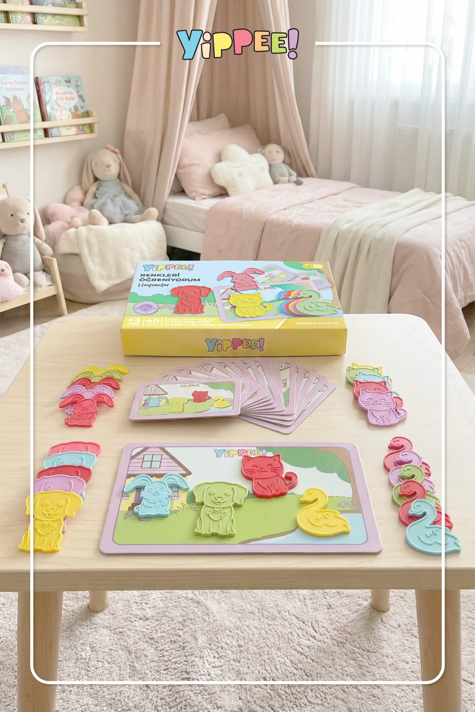 Yippee Renkleri Öğreniyorum – Hayvanlar, çocukların renkleri öğrenmesini, eşleştirme becerilerini geliştirmesini ve el–göz koordinasyonunu güçlendirmesini destekleyen okul öncesi eğitici bir aktivite setidir.
