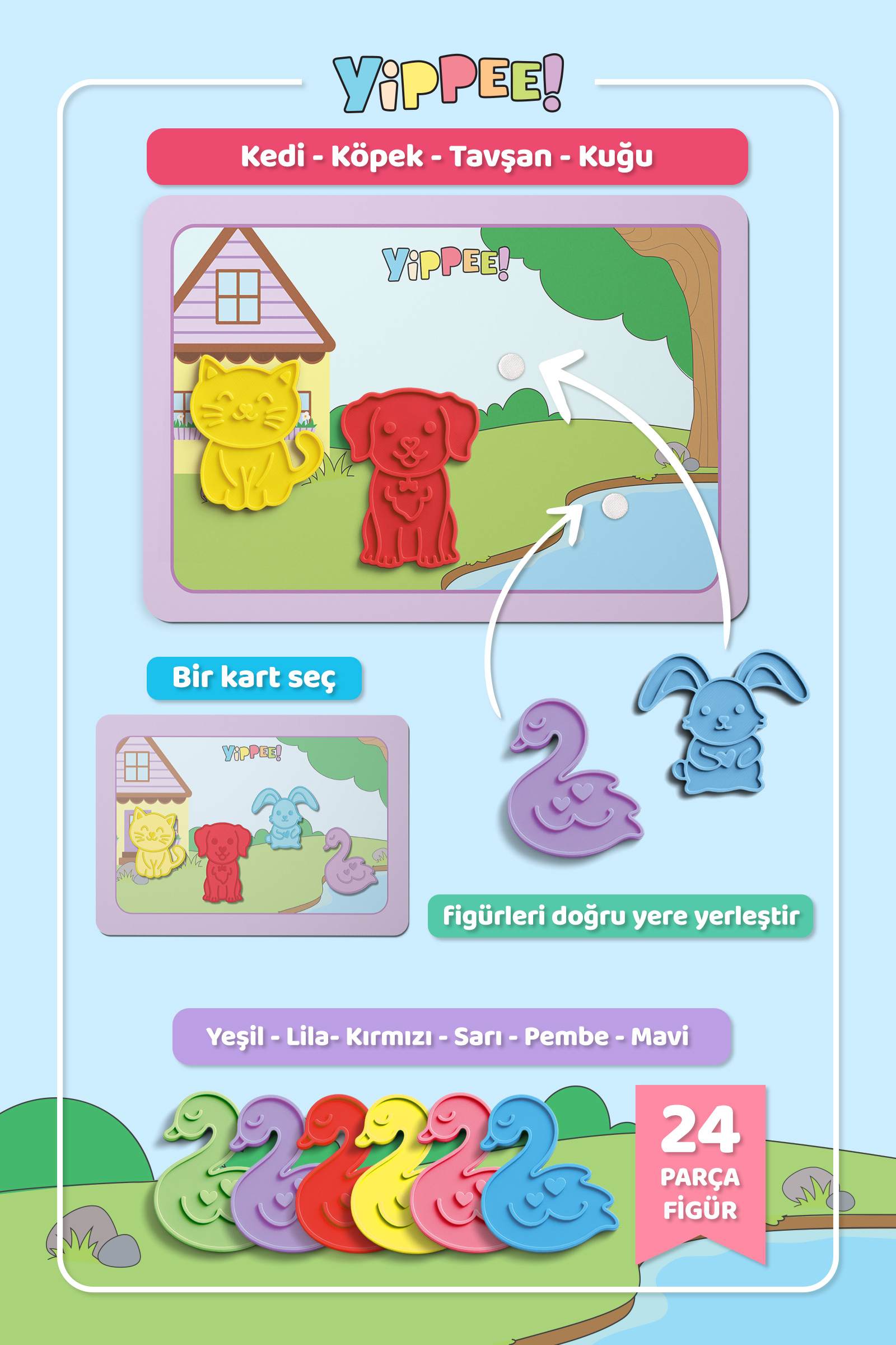 Çocuklar; kedi, köpek, tavşan ve kuğu figürlerini dizilim kartlarına göre doğru yerlere yerleştirerek hem eğlenir hem de renkleri doğal bir süreç içinde öğrenir.