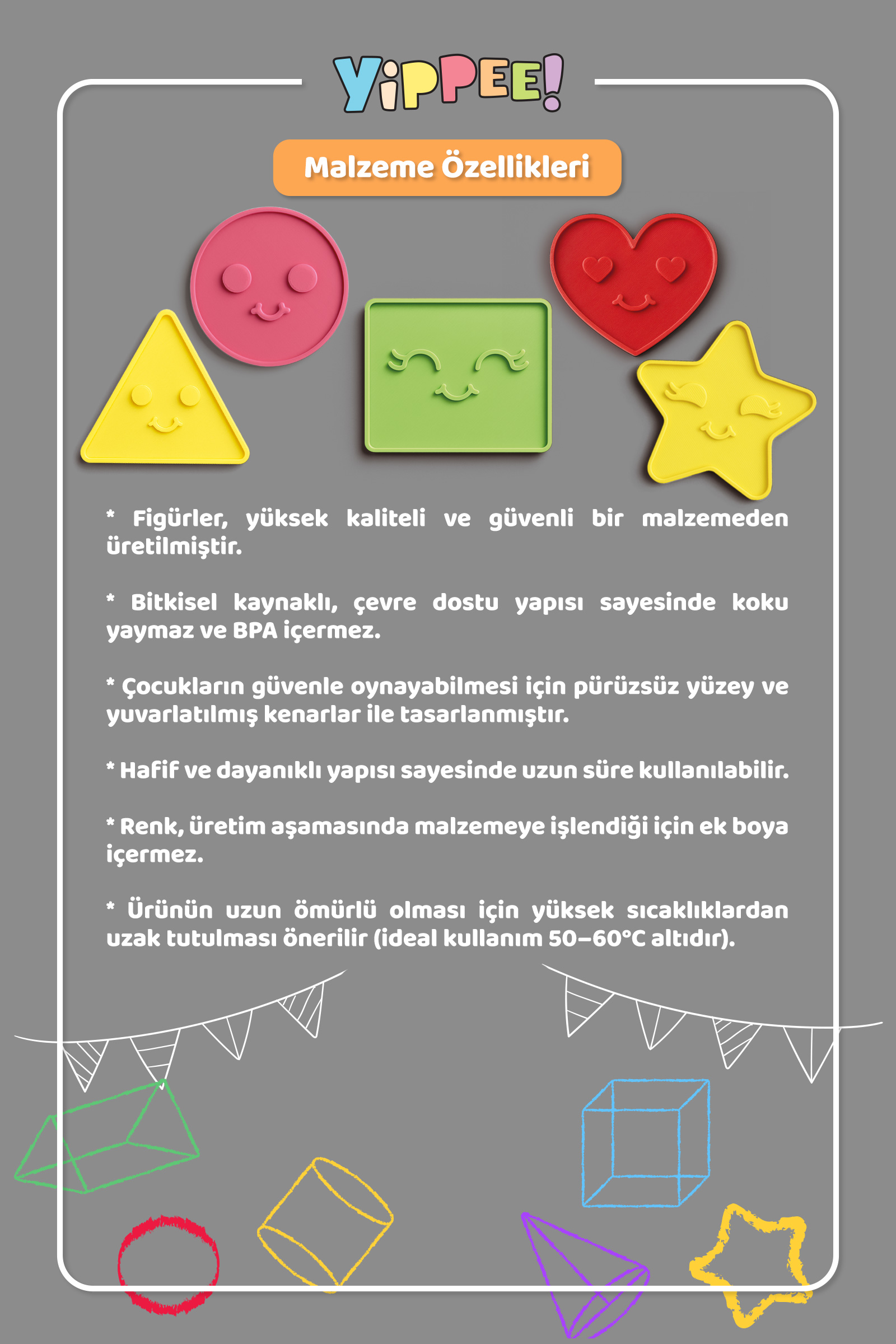 Üçgen, kare, dikdörtgen, daire, yıldız ve kalp gibi şekillerle hazırlanan bu set; çocukların